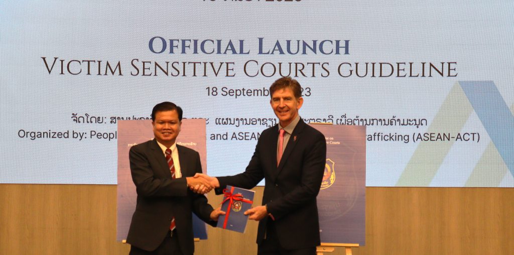 During the official launch on 18 September 2023 in Vientiane, Lao PDR, Vice President of the People’s Supreme Court Lao PDR, HE Bounkhoung Thavisack, emphasised the strong collaboration from all agencies, investigators, prosecutors and the courts to ensure equality and justice to protect the rights of victims of trafficking – especially victims whose dignity has been compromised and require special attention during and after court proceedings.