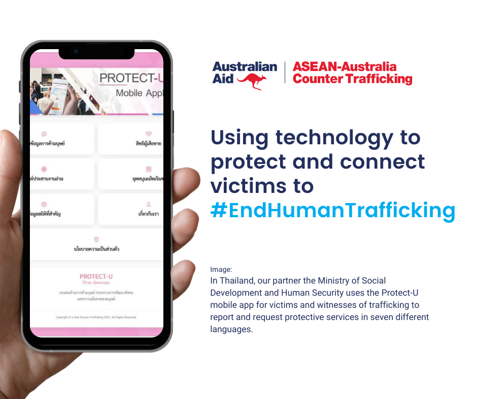 ASEAN-ACT’s partner in Thailand, the Ministry of Social Development and Human Security (MSDHS), uses the Protect-U mobile app for victims and witnesses of trafficking to report and request protective services in seven different languages.