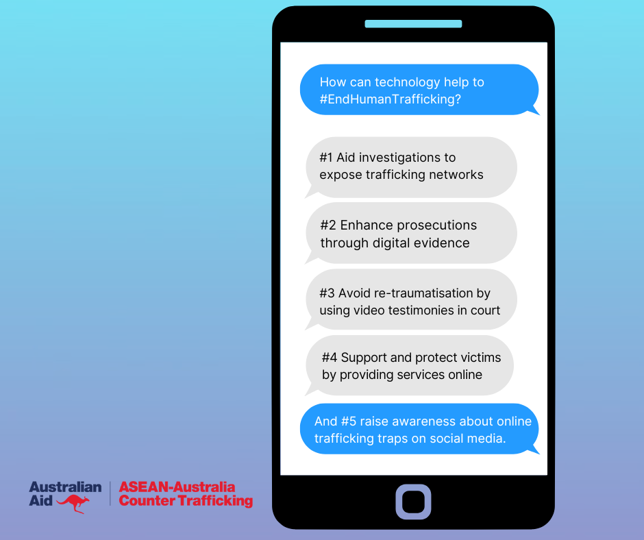 However, technology can be used to improve counter-trafficking efforts. ASEAN-ACT supports ASEAN Member States with good practices in using technology to combat human trafficking, including: